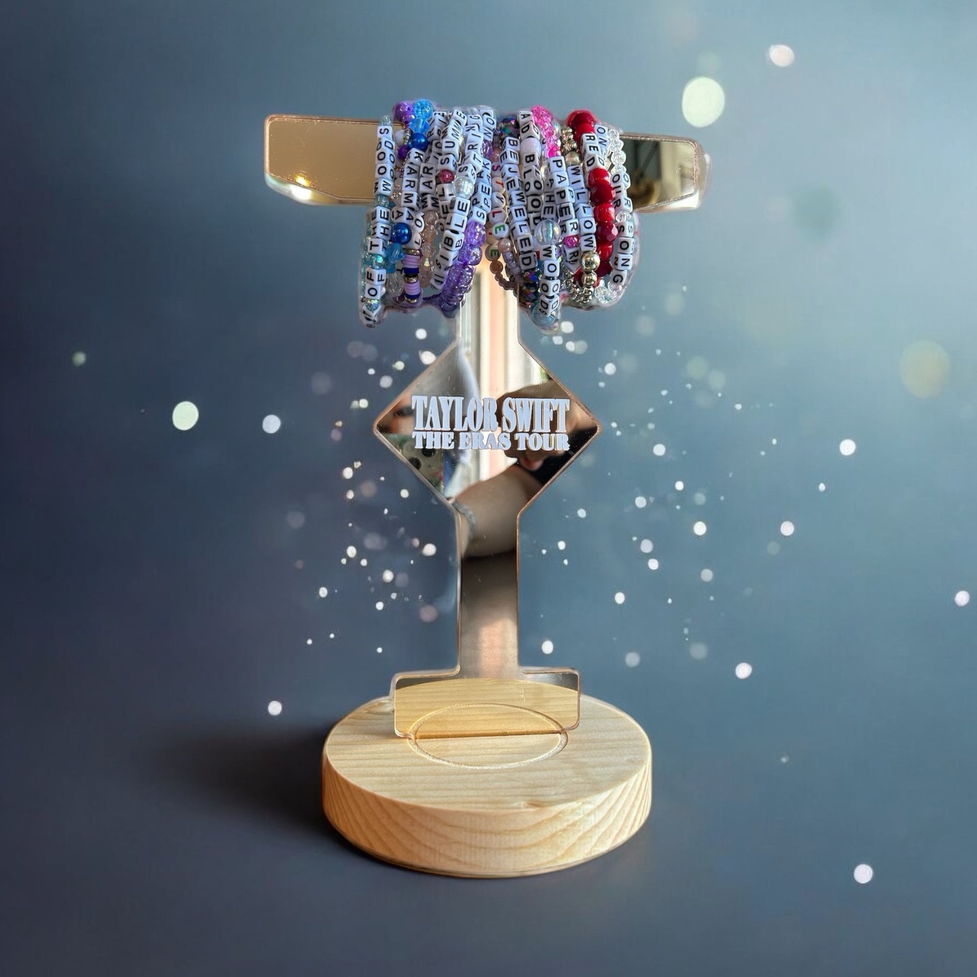 Elevate your cherished Eras tour bracelet collection with our stunning acrylic bracelet stand in mirrored GOLD acrylic Inspired by Taylor Swift's Fearless Era, this unique display piece adds a touch of glamour to your space. This item makes the perfect gift for any Taylor Swift fan in your life!